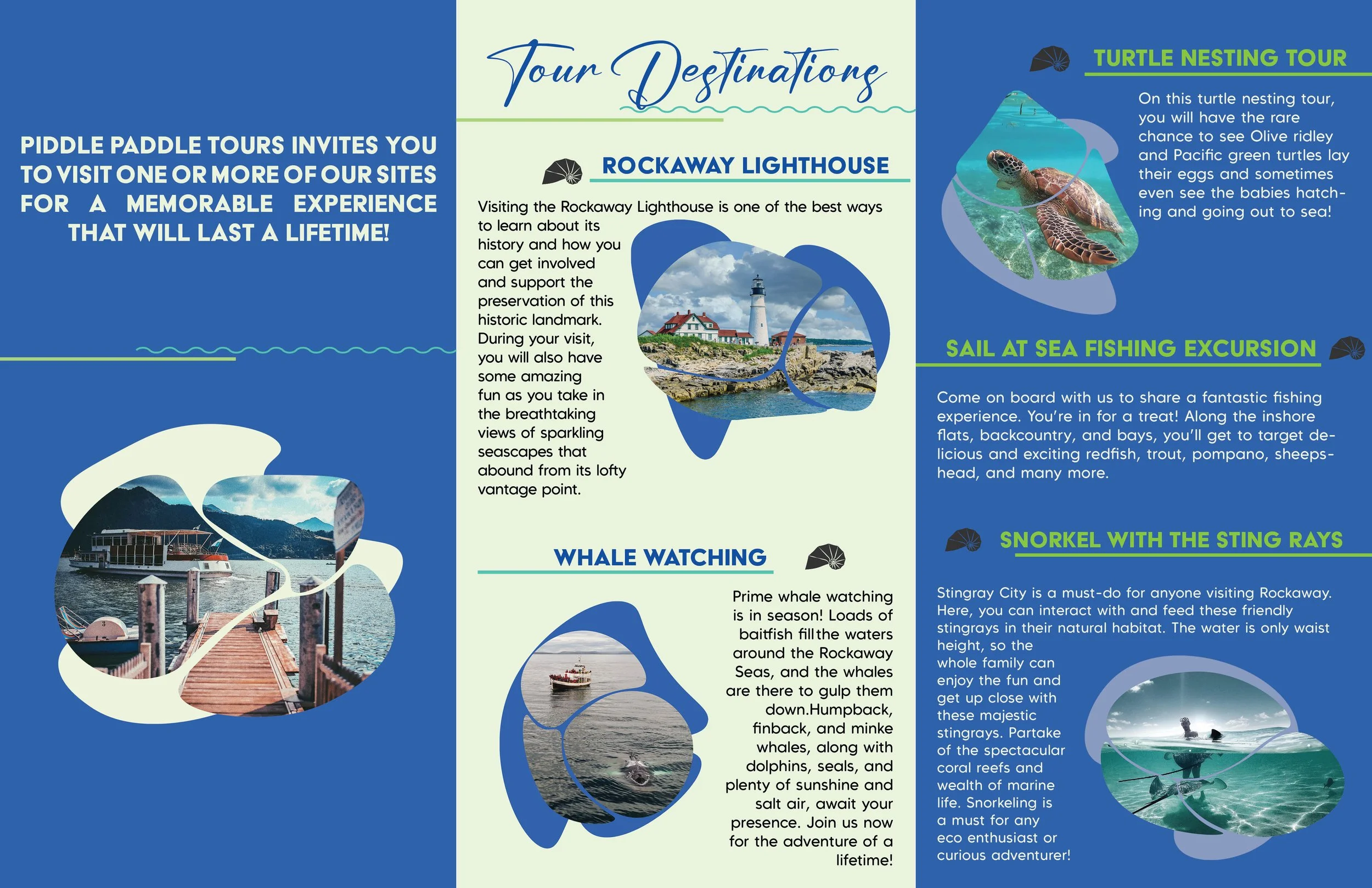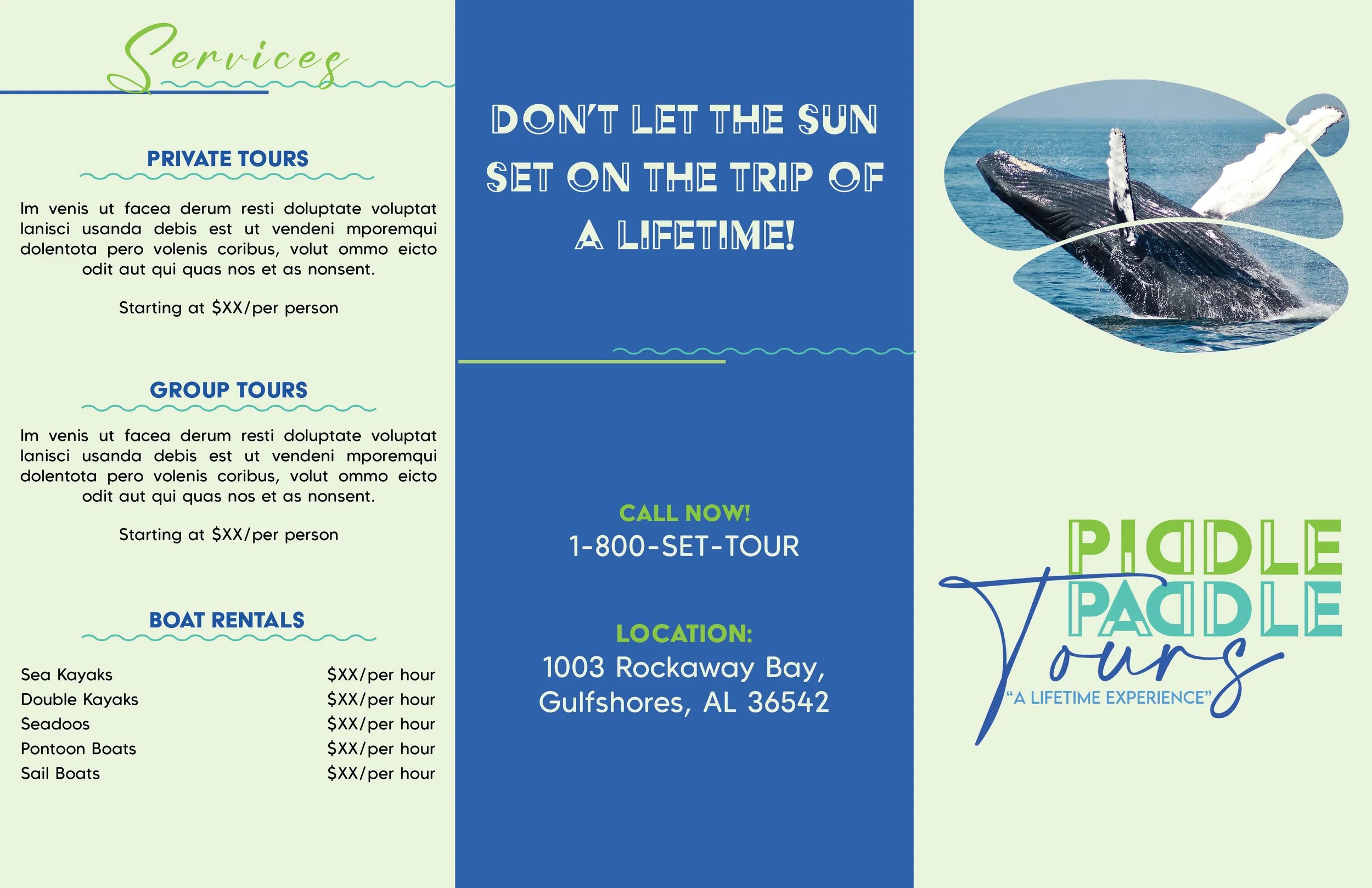 The prompt: Create a trifold pamphlet for a boat touring service called Piddle Paddle