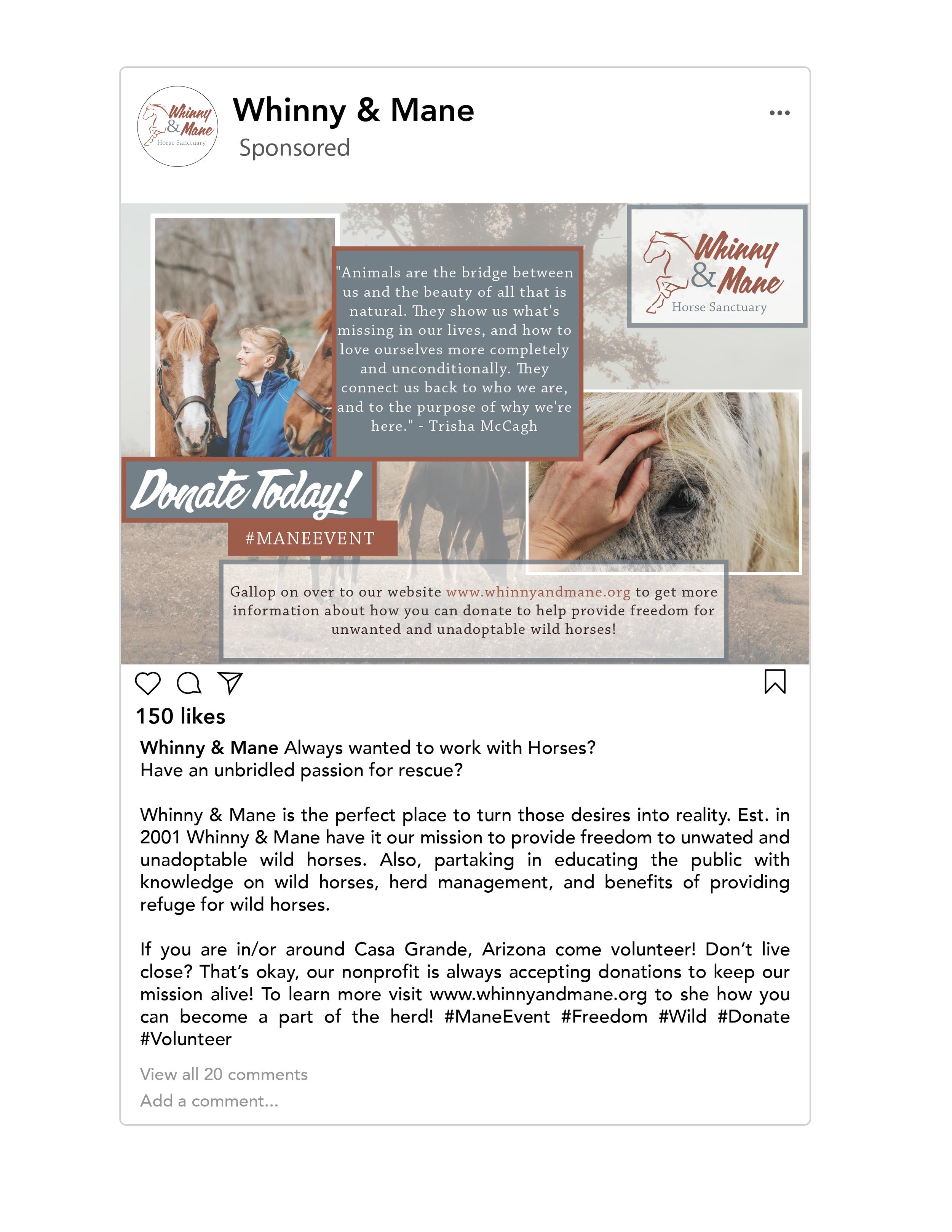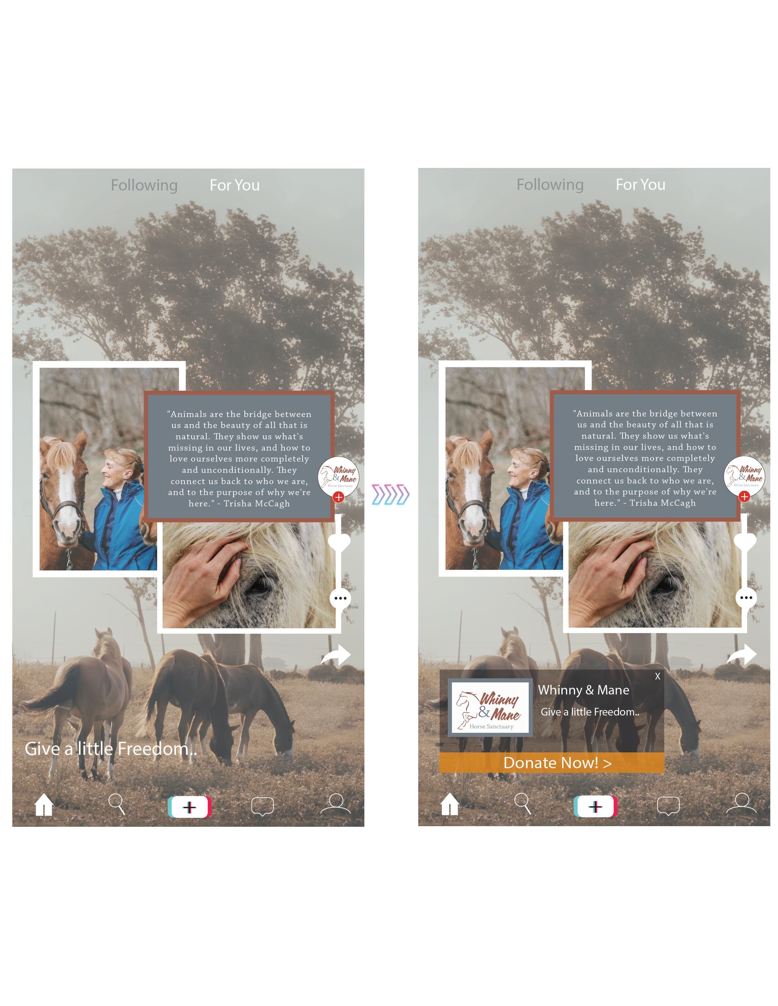 Prompt: Design Instagram and TikTok posts for the non-profit horse rescue Whinny & Mane, emphasizing a strong call-to-action to drive volunteer engagement.