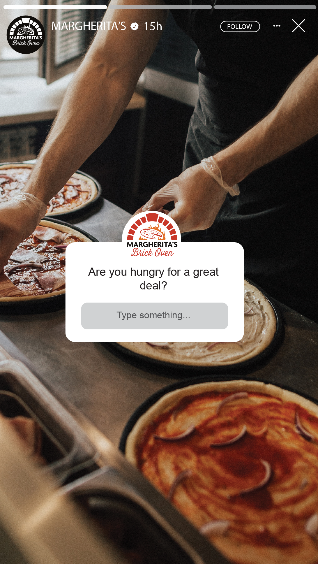 Prompt: Design an Instagram Story for a fictional pizza restaurant, Margherita’s Brick Oven, with a focus on creating engaging content that encourages audience interaction and brand engagement.